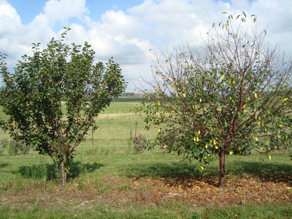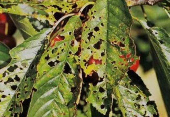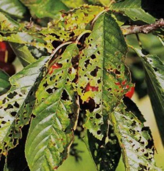 После влажной весны, которую сменяет дождливое лето, в плодовом саду можно наблюдать совершенно нетипичную картину: листья опали, а на голых ветвях зреющие плоды вишни. Это происходит во второй декаде июля. Листья желтеют и опадают, а плоды на таких деревьях мельчают и мумифицируются, что приводит к полной или частичной потере урожая.