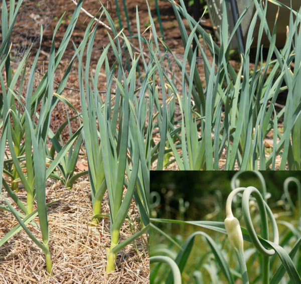 - Стрелки, до момента созревания свёрнутые в спирали, наоборот, выравниваются и грубеют.Стрелки чеснока в начале лета (слева) обычно скручены в спираль, которая выравнивается по мере созревания (справа)