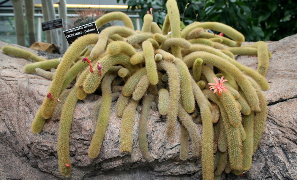 Белым пушистым столбиком выглядит на кактусной ландшафтной горке и клейстокактус Штрауса. Прямостоячий стебель окружен молодыми побегами, также покрытыми серебристыми тонкими иглами. На стволе насчитывается 15-25 ребер, Растет этот кактус медленно, цветение начинается на 5 год жизни. Зато в эту пору он необычайно красив: красные «трубки» длиной до 10 см, а в диаметре – 1, 5 см, а затем красные же шары плодов украшают серебристо-зеленый стебель.