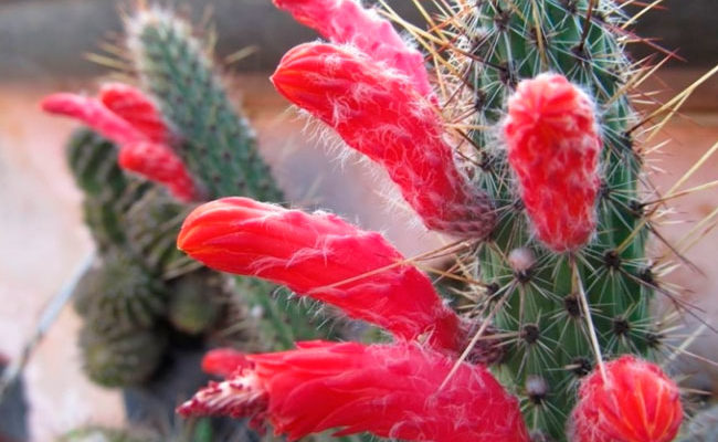 • Клейстокактус туписийский (Cleistocactus tupizensis). Стебли у этого растения вертикальные, прямостоячие, высотой около 1 м. Отличительная черта – красно-рыжие колючки, густо обрамляющие побеги. Цветки также имеют яркий красный оттенок.