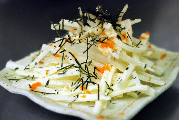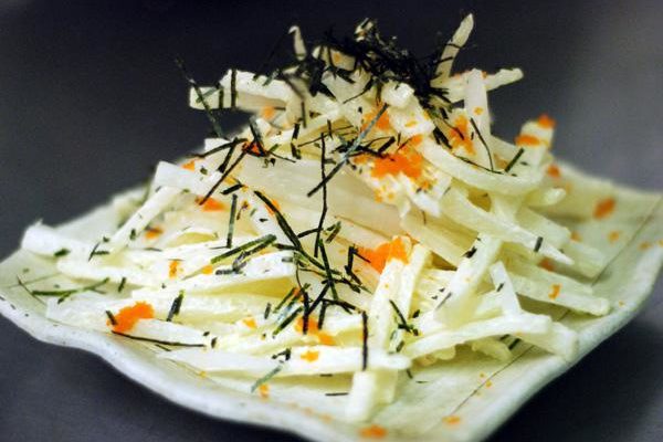 - Дайкон под майонезом. Дайкон 250 г, майонез 60 г, соль по вкусу. Корнеплод вымыть, очистить от кожица мельчить на крупной терке, заправить майонезом, посолить, перемешать, украсить зеленью.