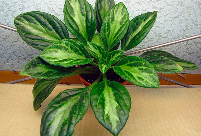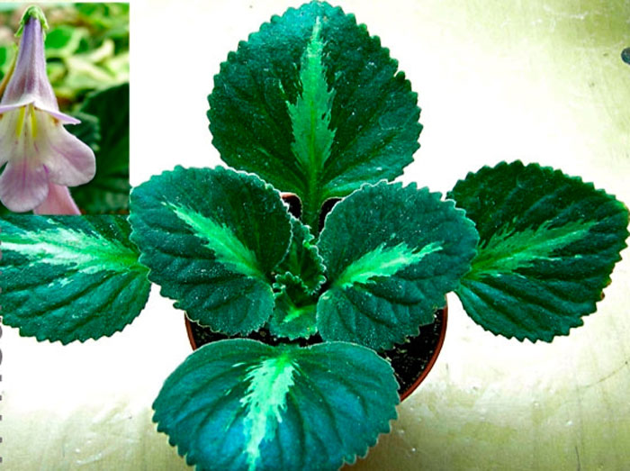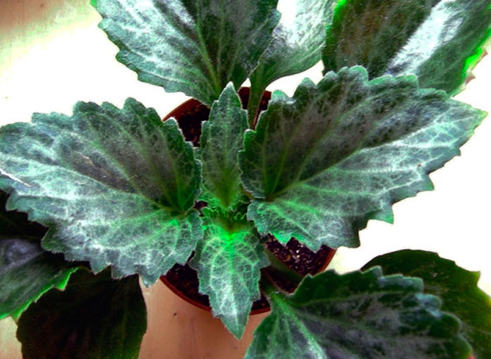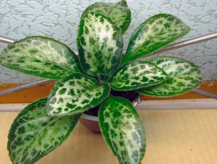 Лишь у некоторых видов листочки внешне отдалено схожи с фиалкой. Располагаются они супротивно и имеют коротенькие либо средней длины черешки. Их поверхность может быть глянцевой, слабоопушенной, а также бархатистой (с густыми волосками). Форма листовых пластин напрямую зависит от вида и сорта и может быть яйцевидной, ромбической, округлой, линейной, лопатовидной либо языковидной. У большего числа видов на поверхности листочков полоски и прожилки светлого либо серебристого окраса. На фотографиях невозможно оценить всей красоты листочков. Дело в том, что светлые узоры словно сияют, и если на такое растение смотреть вживую, то создается впечатление, что на листья разлито жидкое серебро, которое беспрерывно течет. Такой эффект чем-то схож с тем, что имеется у драгоценных орхидей.