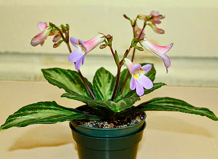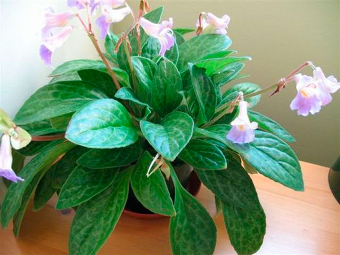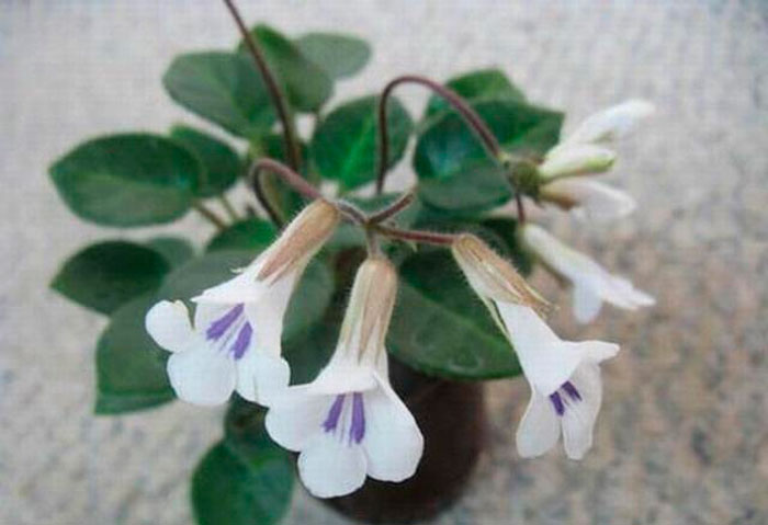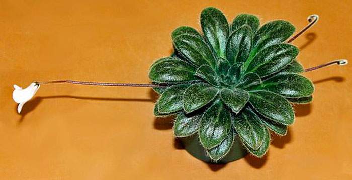 Изящные цветочки данного растения могут посоревноваться в своей красоте с орхидеями, однако их устройство и форма совершенно простая. Такие цветочки имеют определенное сходство с глоксиниями, а также с горечавками. Пятилепестковые цветки имеют трубчатую форму, при этом трубка у них достаточно узенькая. А обладают они светло-пастельным либо беловатым окрасом. На поверхности самого цветка и несимметричного зева находятся полосы лилового и темно-фиолетового окраса. На достаточно длинных цветоносах, высота которых всегда превышает высоту листовой розетки, располагаются соцветия, имеющие форму кисти. Они достаточно рыхлые и состоят из 3–7 цветочков. В соцветиях цветки, так же как и листья располагаются симметрично и не очень густо, что способствует подчеркиванию красоты и изящества данного растения во время цветения.
