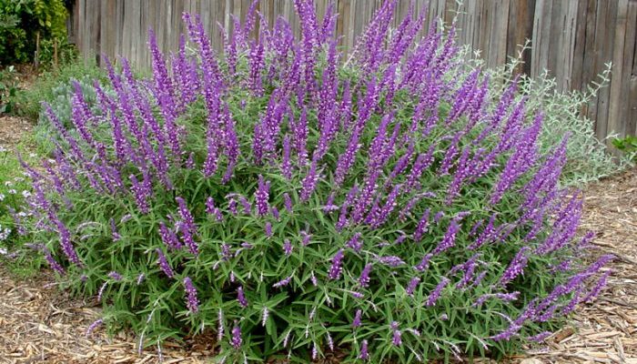 Сверкающая сальвия фиолетовая является очень эффектным растением. Дело в том, что насыщенно-фиолетовый окрас многократно усиливается густым опушением.